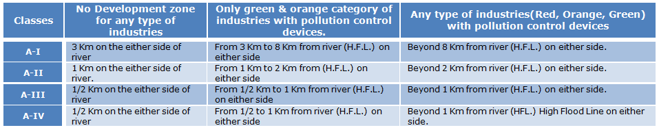Environment Department has notified the industrial location policy from environment angle in the river catchments. Accordingly, the river catchments have been categorised in 4 categories i.e. A-I, A-II, A-III and A-IV based on the river water quality. Accordingly, from origin up to the first dam the river shall have desired water quality A-I. From first dam up to the area designated as A-II, the river quality shall be as prescribed in A-II, While in A-III classified area, the river quality shall be suitable for fisheries and wildlife. In A-IV zone, the river quality should be suitable for agricultural and Industrial usages.
